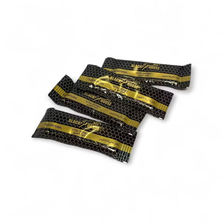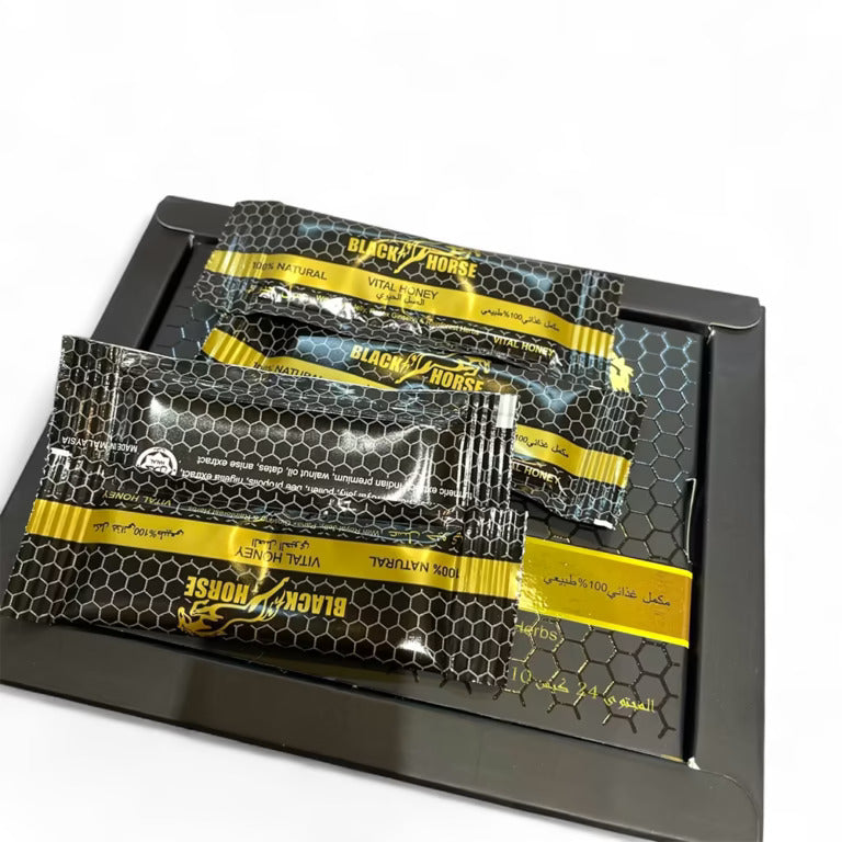 Black Horse Vital Honey features a premium mixture of Pure Honey, Royal Jelly, and Nigella Sativa in easy-to-use 10g sachets. Curated for daily vitality, this Pack of 24 delivers a natural source of energy and general wellness. A distinctive herbal blend enriched with Bee Propolis and natural ingredients.